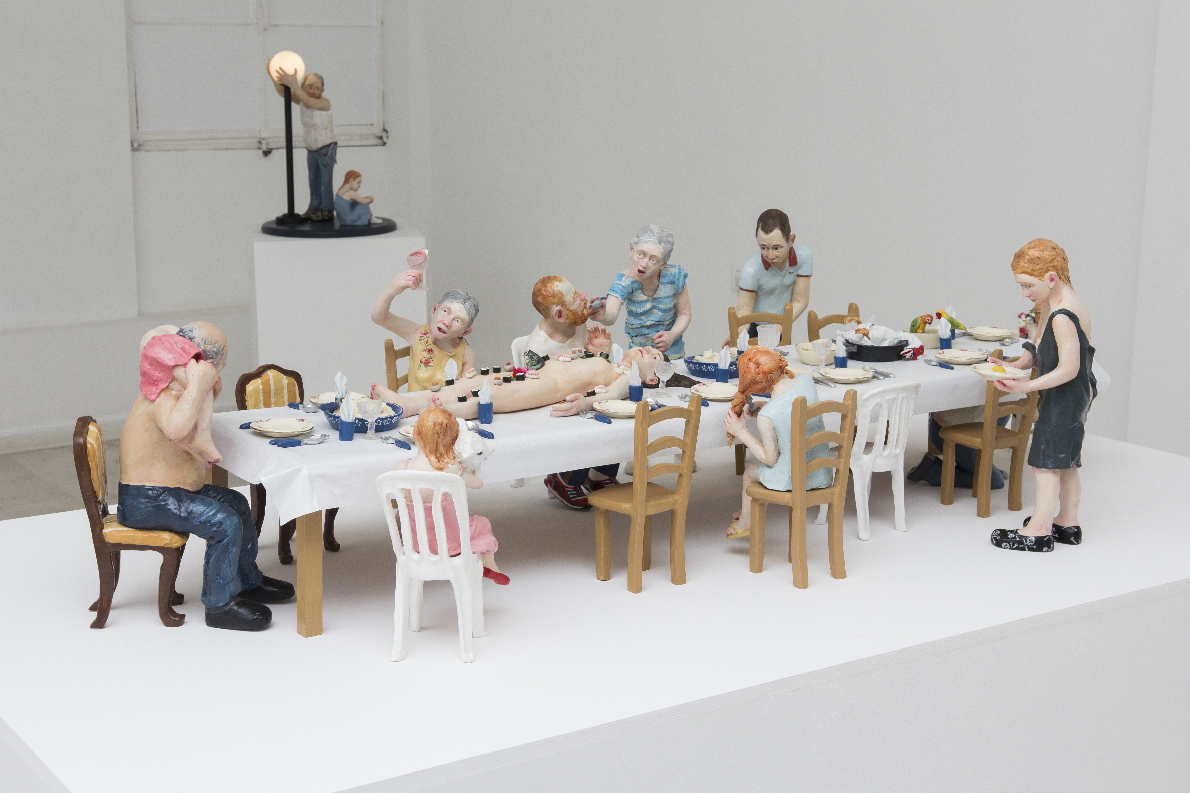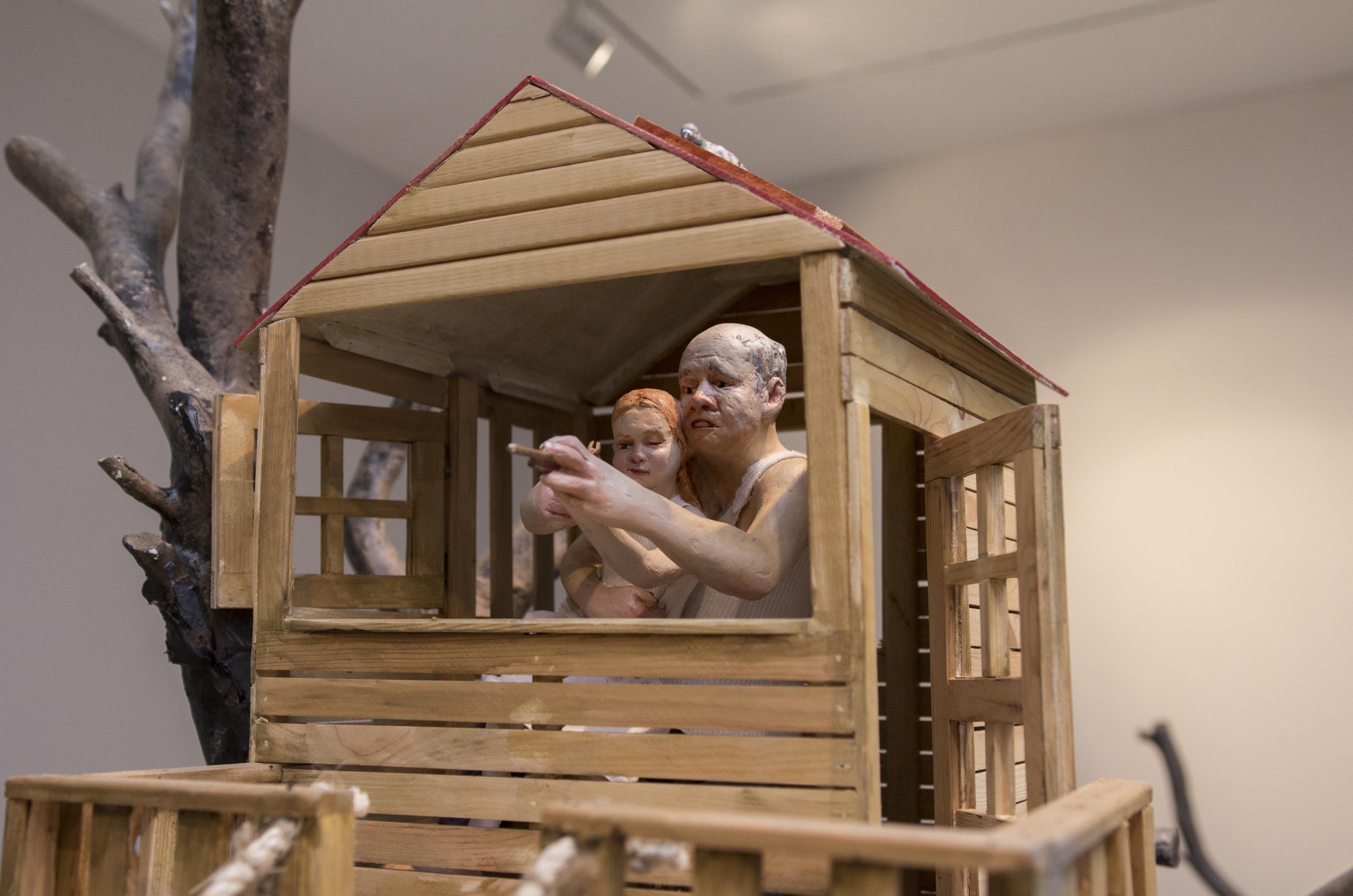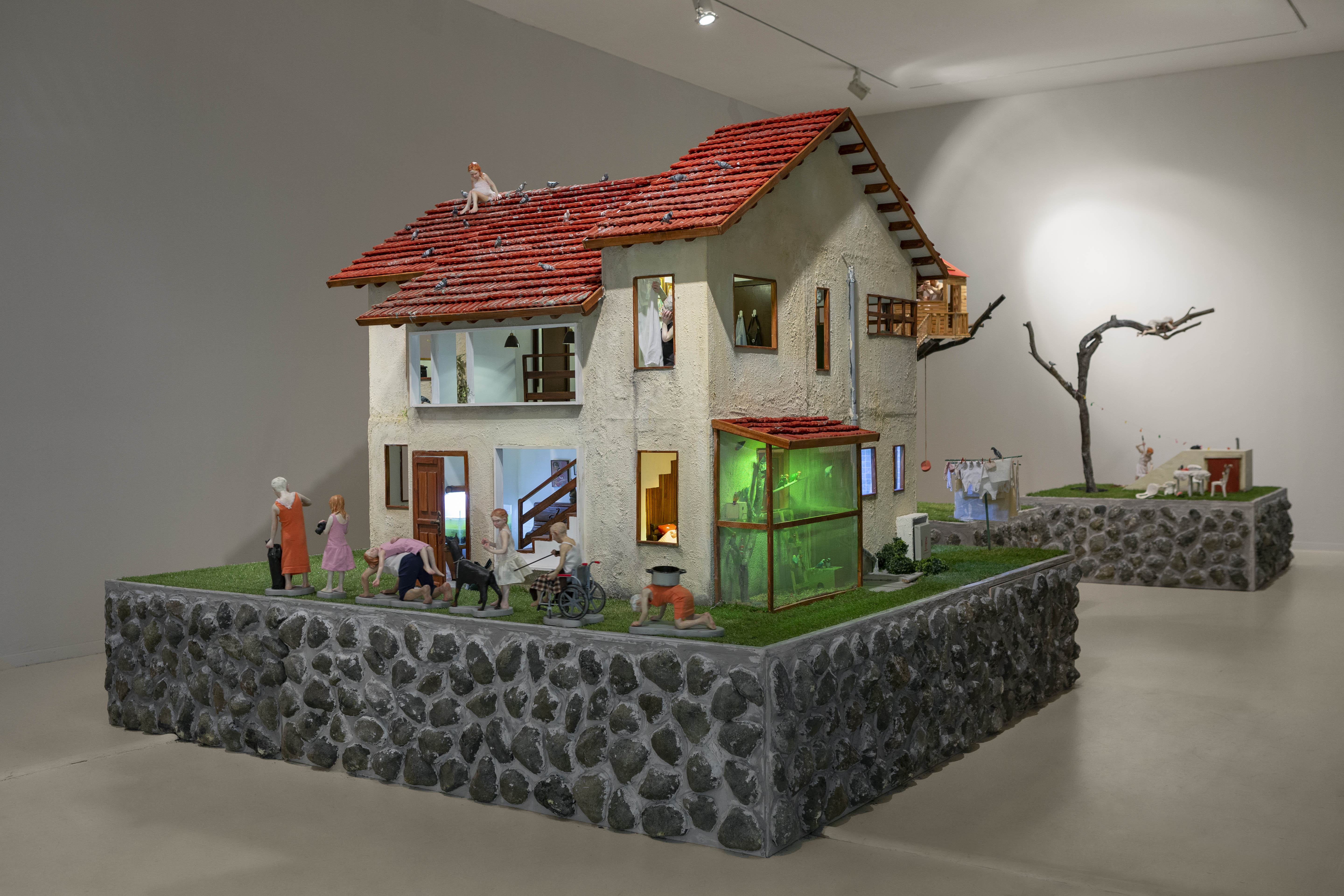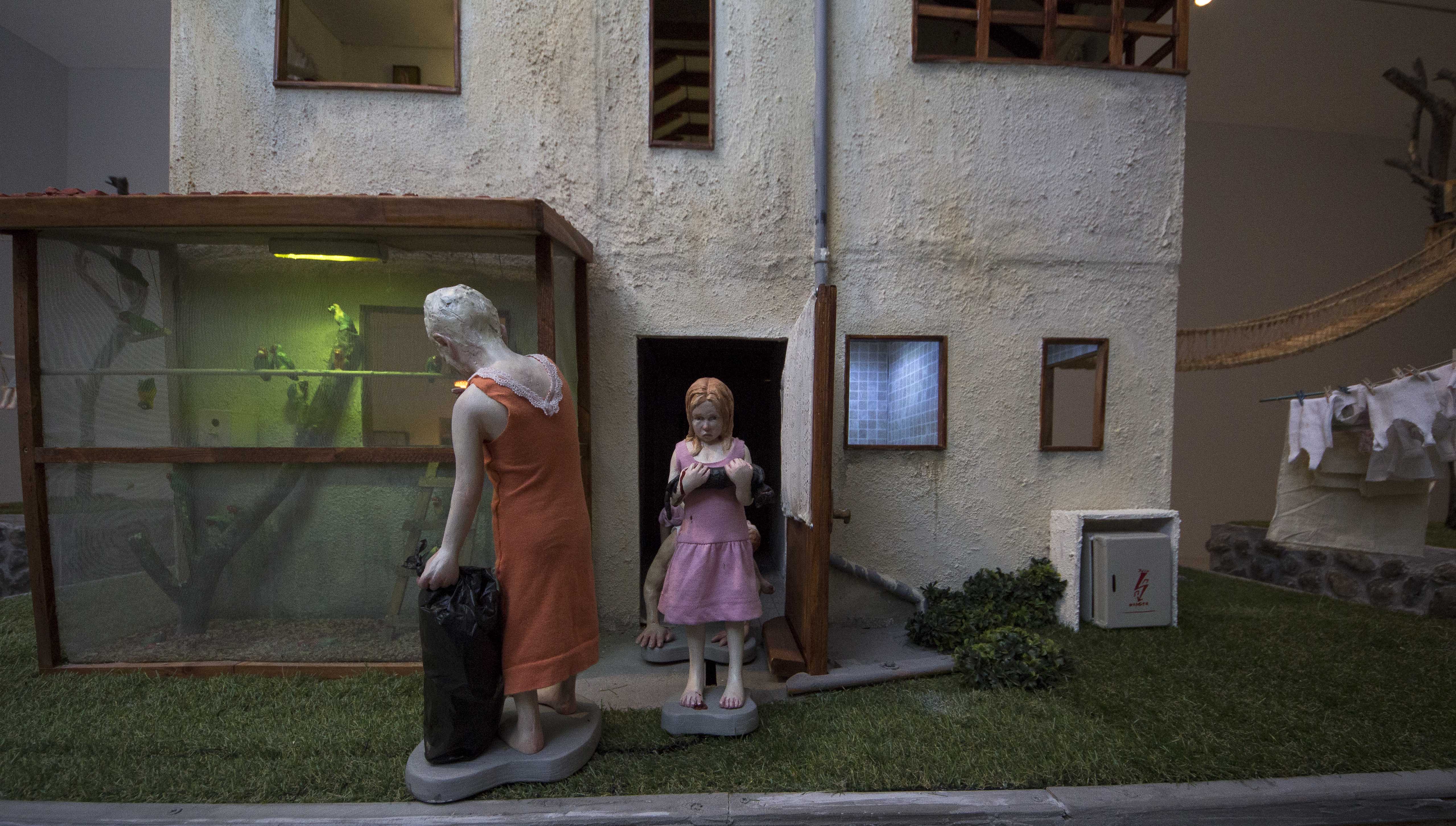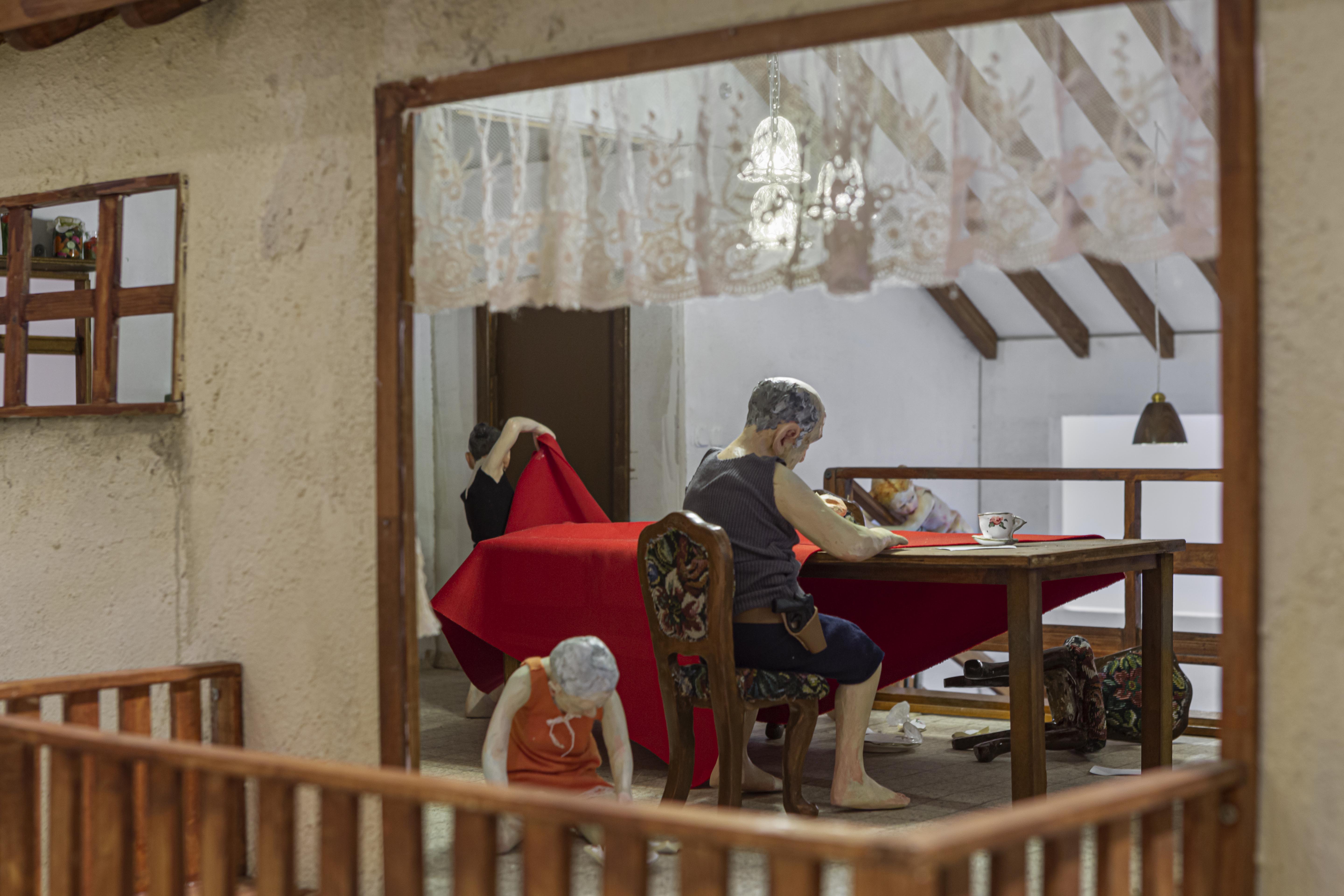 Among the various scenes that took place inside In the house, one could find a worried mother looking from the window to the street, not knowing what or whom she was expecting, a woman who was perhaps sinking, perhaps drowning herself in the bathtub, or a girl listening to the heartbeat of a father lying on the living room sofa. Hidden engines were attached to some of the components of the installation, which allowed the cyclical, endless and futile movement of objects and figures, while evoking thoughts of time, maturation and ageing, of life and death: the father running nowhere on a hamster wheel attached to the wall of the house, a woman repeatedly plucking greying hairs from her scalp, or a convoy of family members leaving the house, surrounding and returning to it - led by the figure of a grandmother holding a black garbage bag, which never reaches its destination.