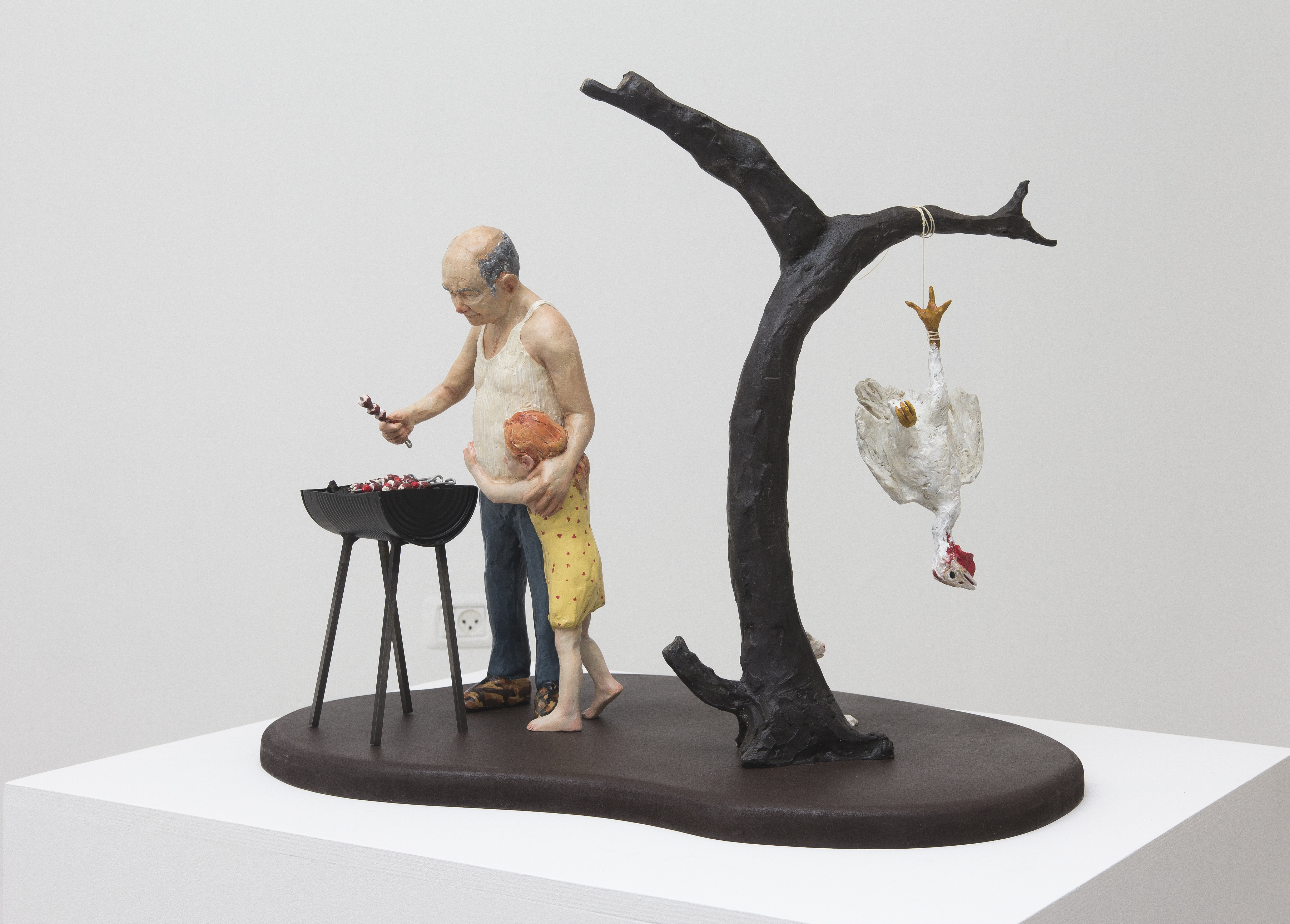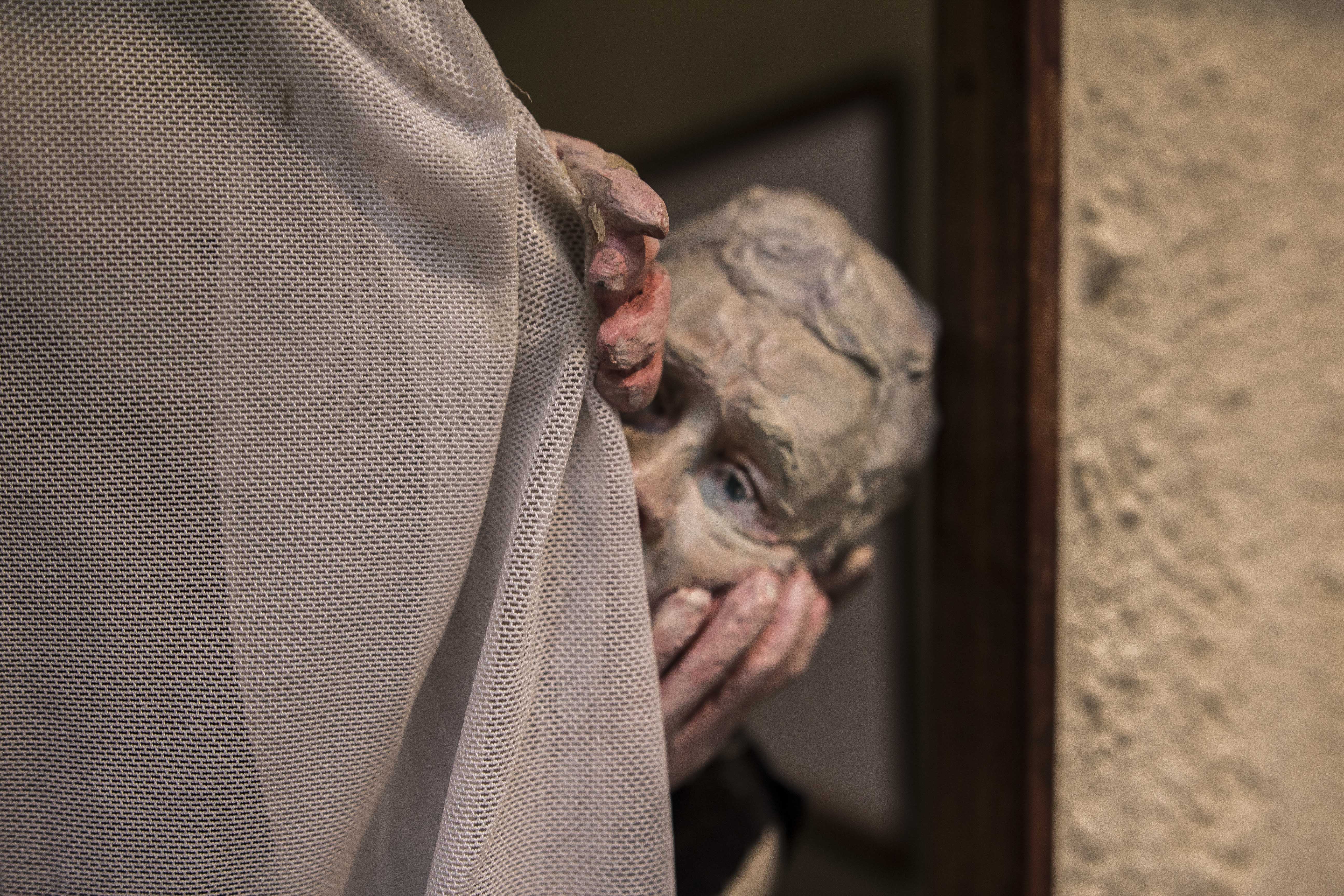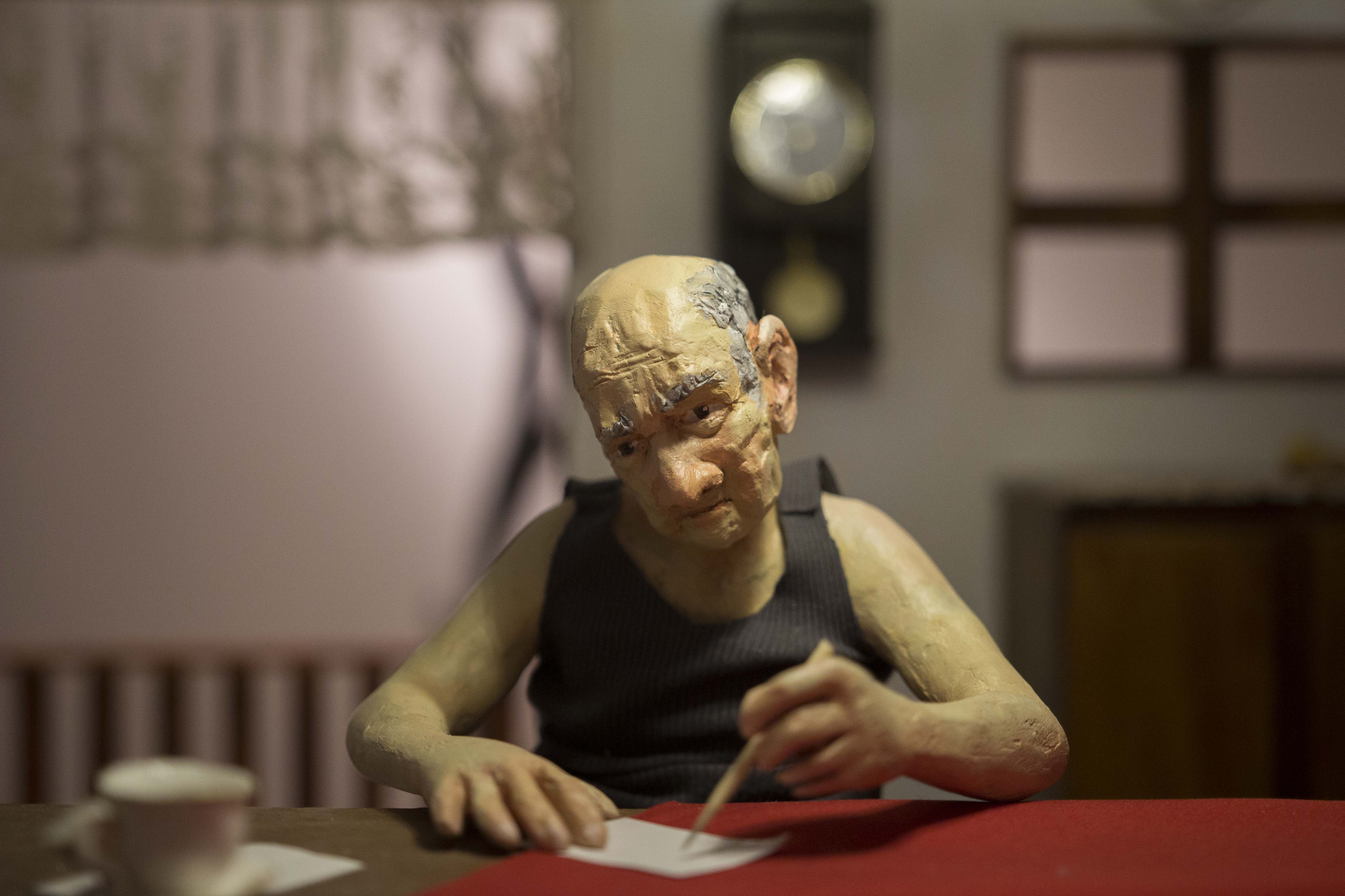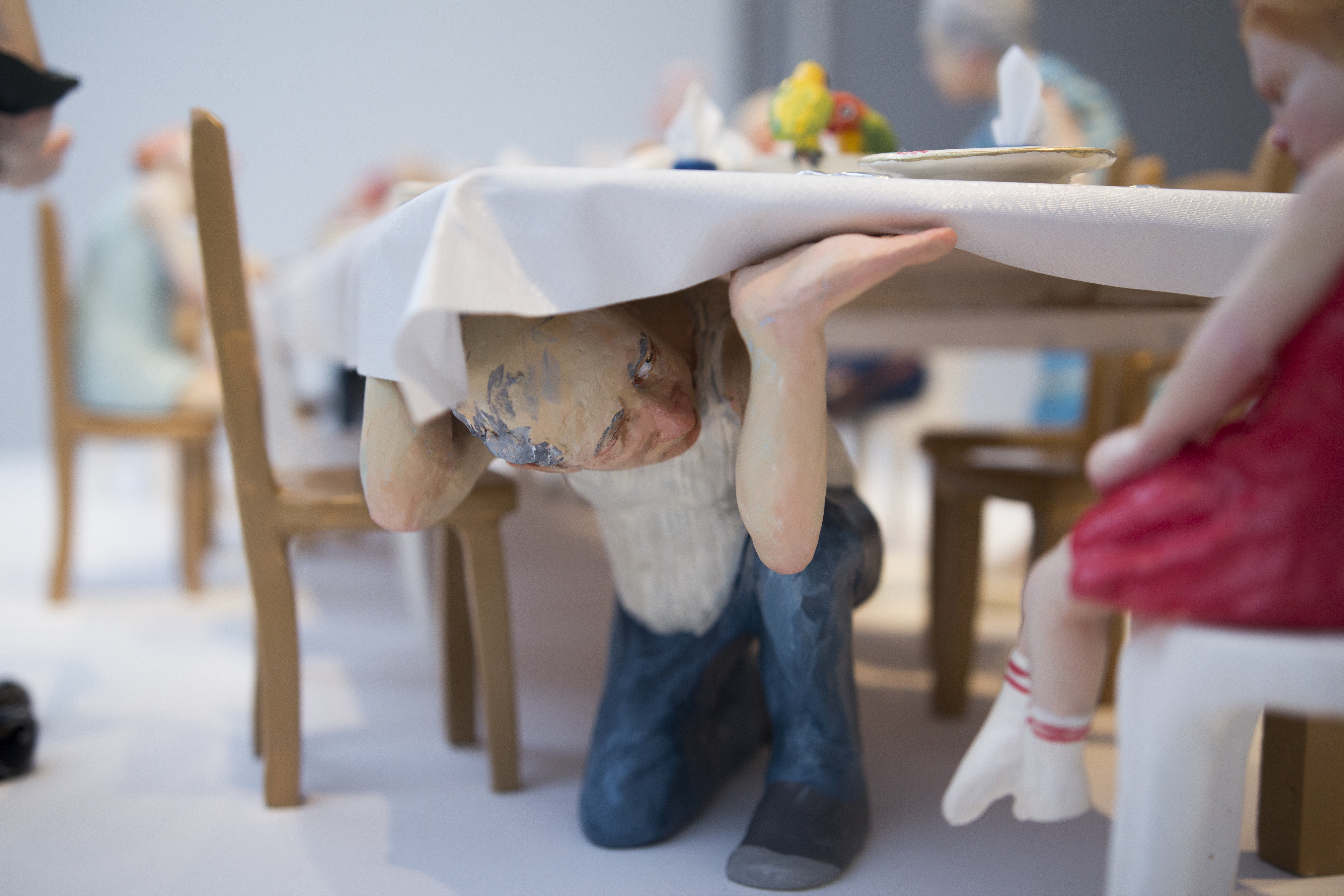 Among the various scenes that took place inside In the house, one could find a worried mother looking from the window to the street, not knowing what or whom she was expecting, a woman who was perhaps sinking, perhaps drowning herself in the bathtub, or a girl listening to the heartbeat of a father lying on the living room sofa. Hidden engines were attached to some of the components of the installation, which allowed the cyclical, endless and futile movement of objects and figures, while evoking thoughts of time, maturation and ageing, of life and death: the father running nowhere on a hamster wheel attached to the wall of the house, a woman repeatedly plucking greying hairs from her scalp, or a convoy of family members leaving the house, surrounding and returning to it - led by the figure of a grandmother holding a black garbage bag, which never reaches its destination.