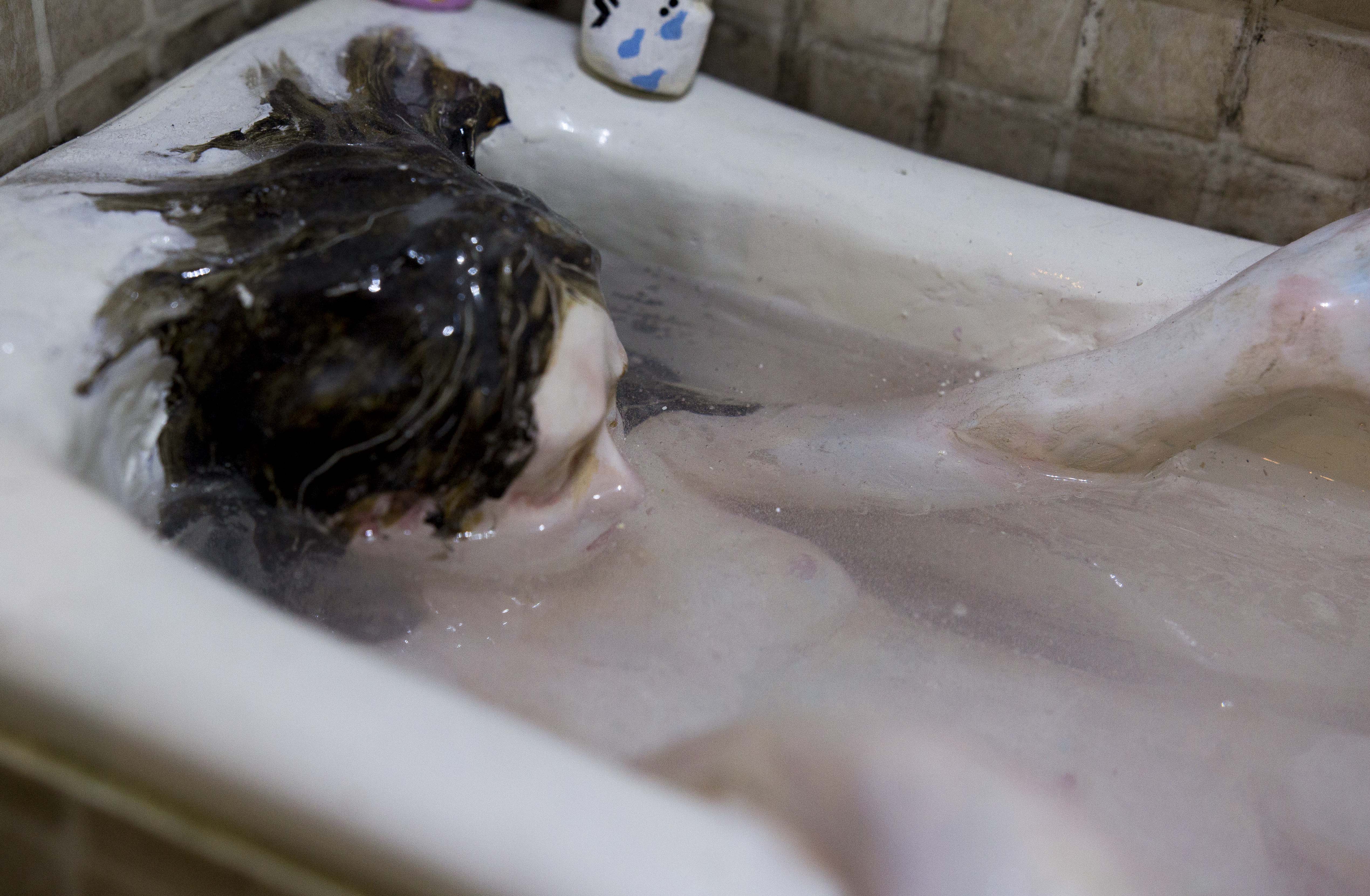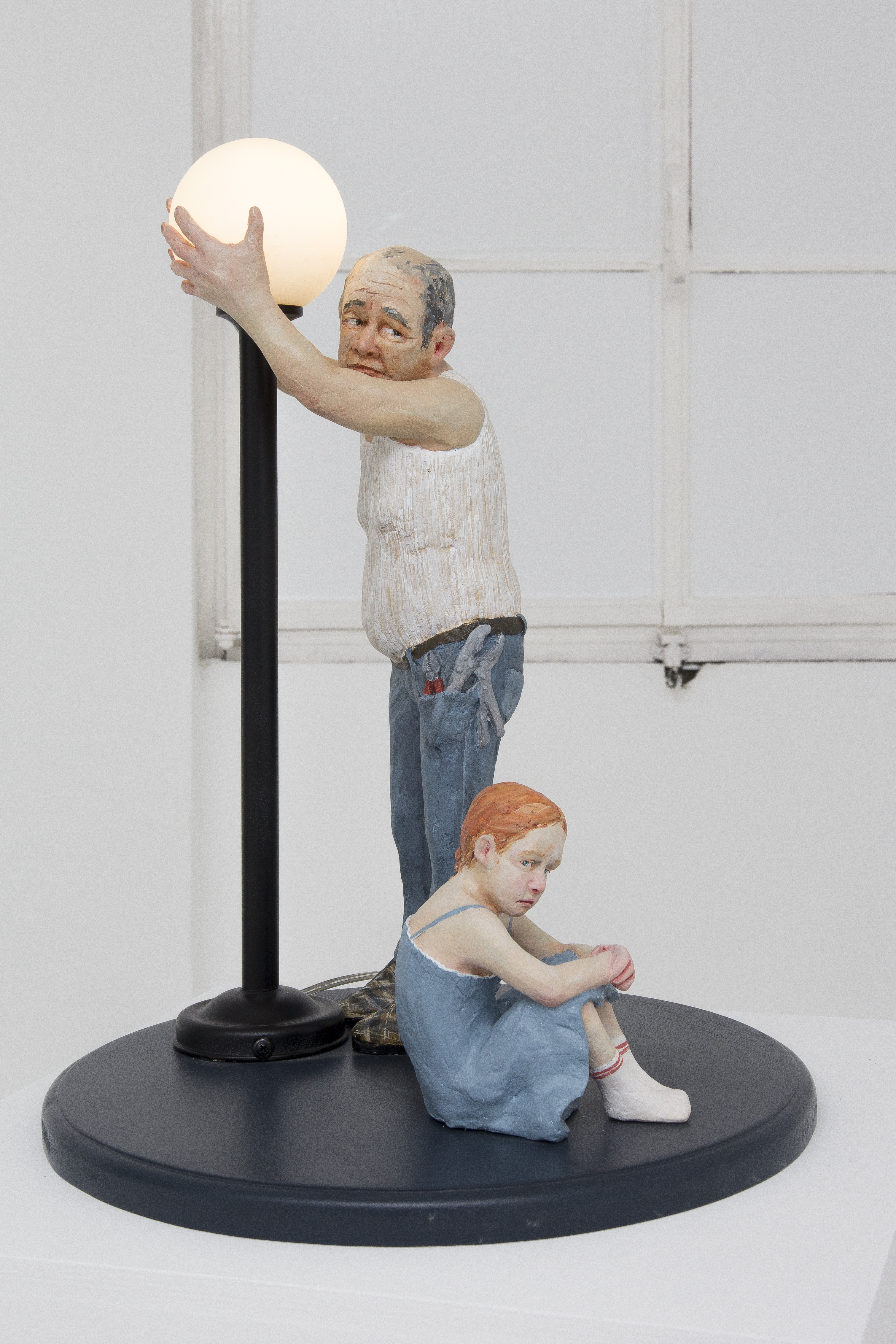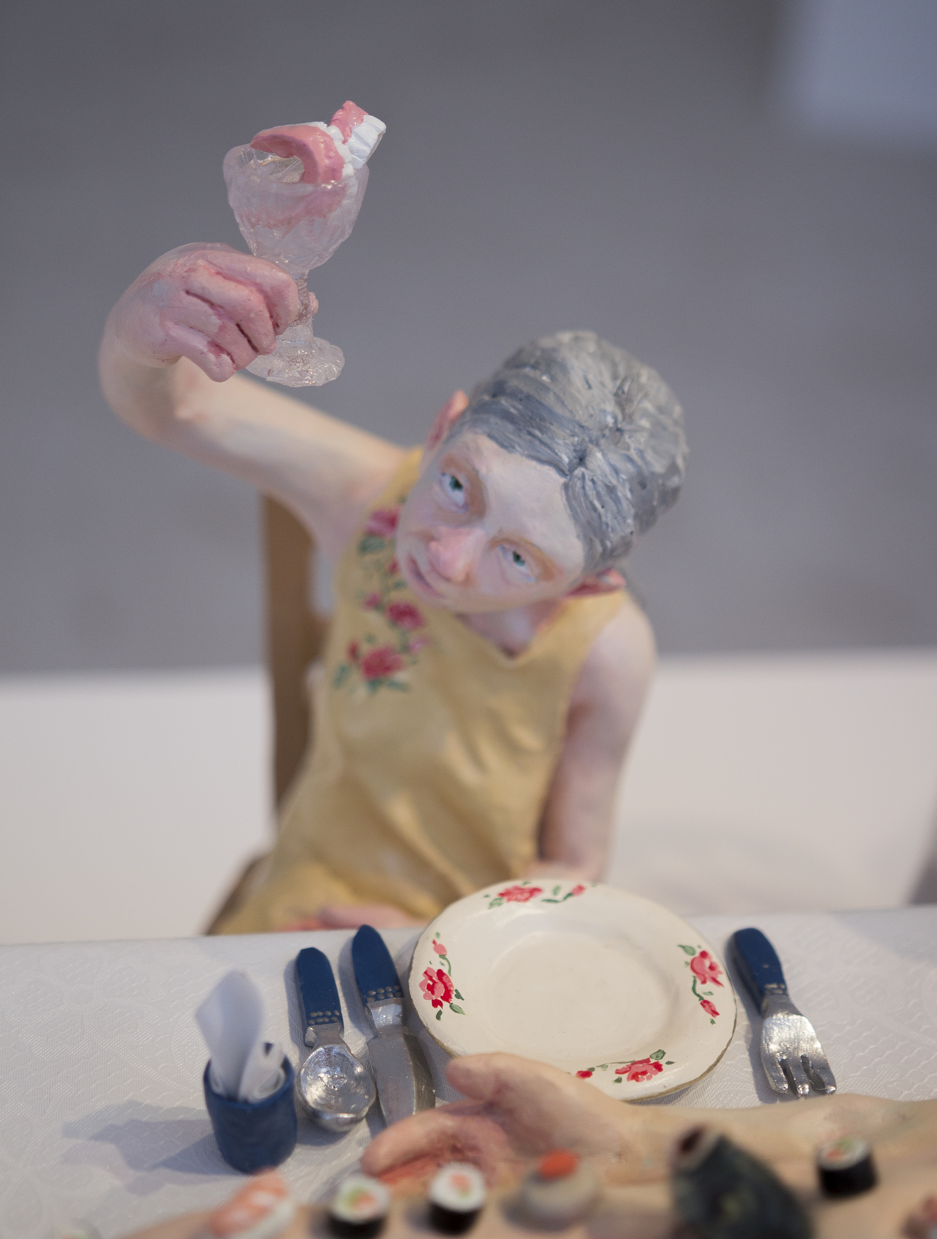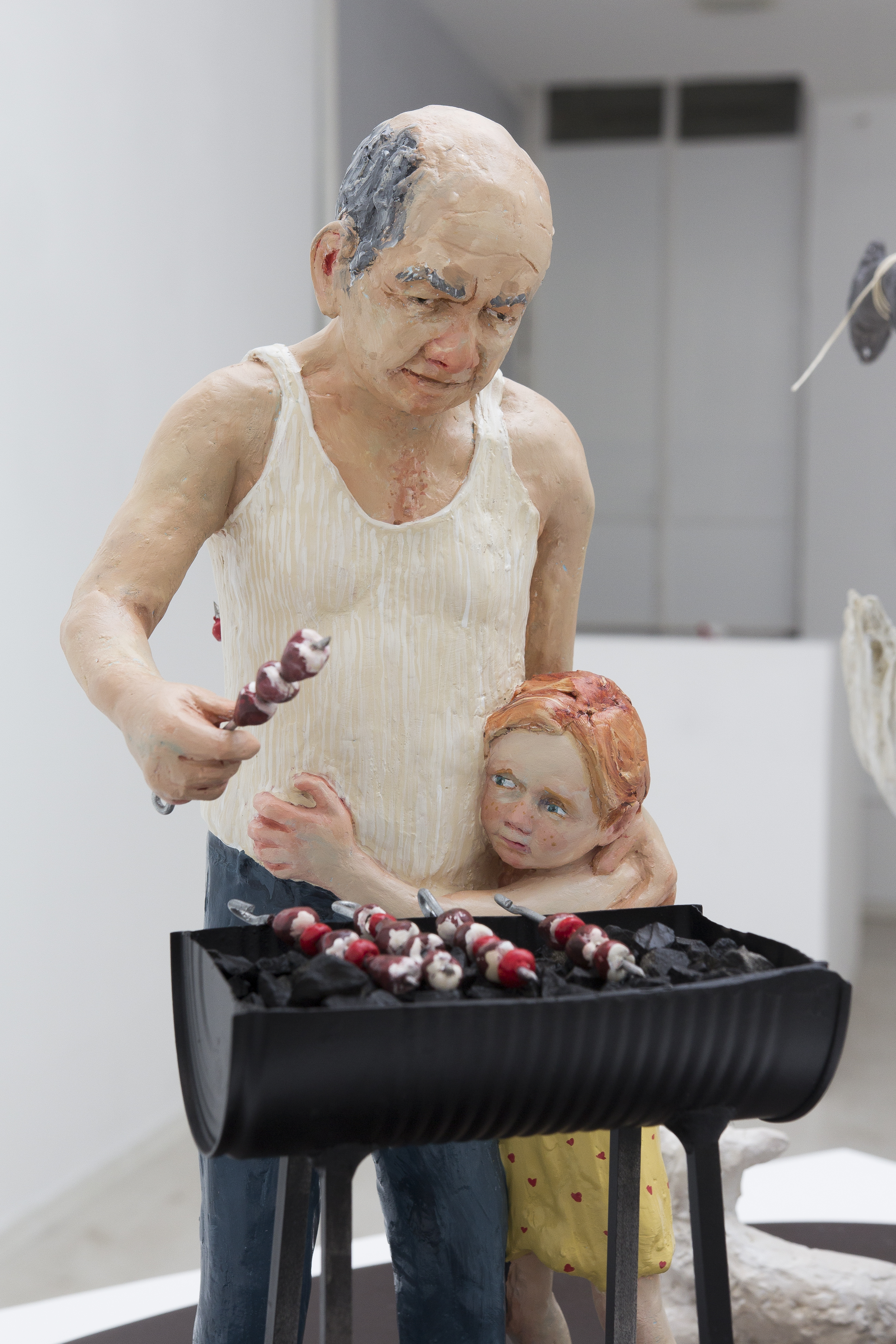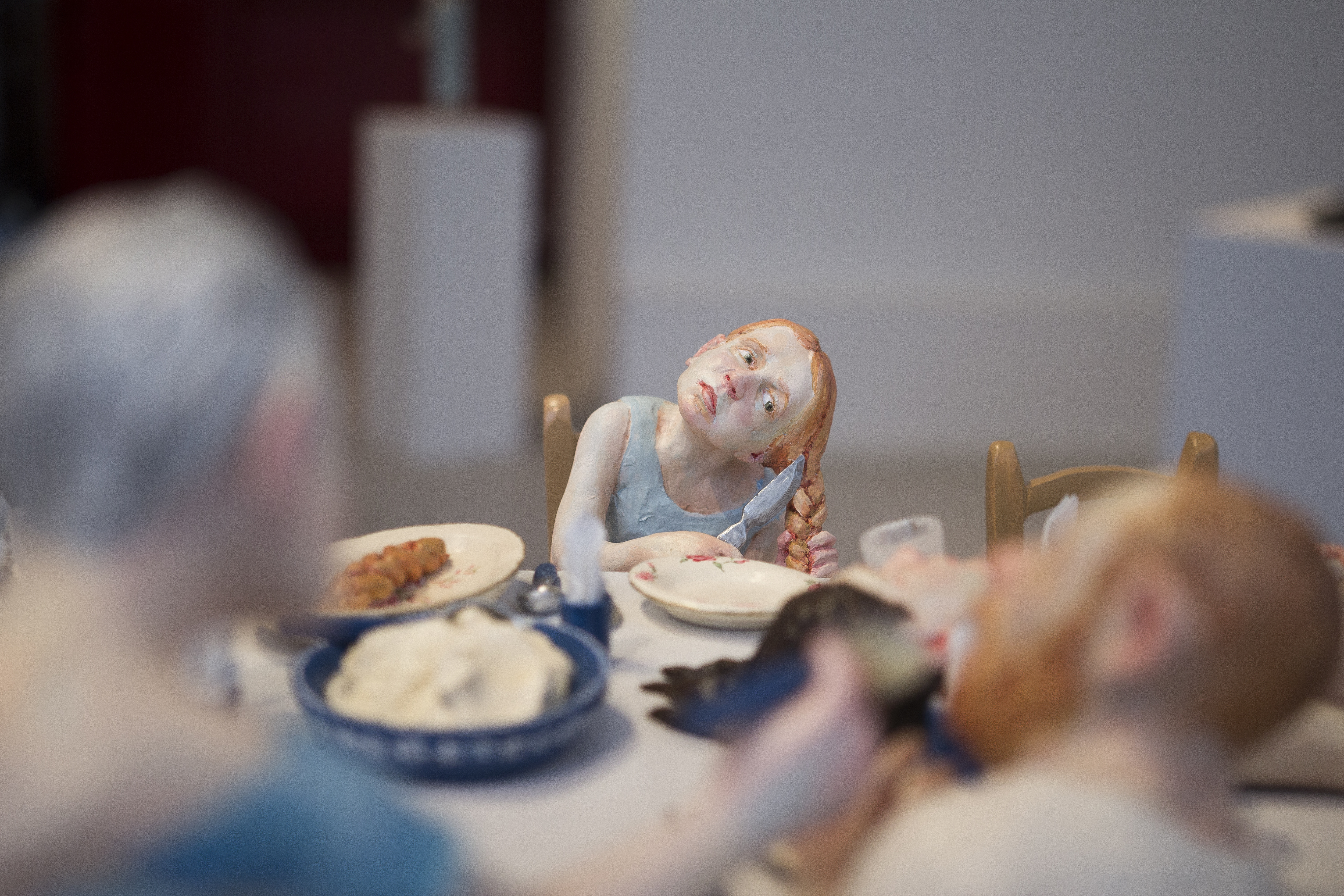 Among the various scenes that took place inside In the house, one could find a worried mother looking from the window to the street, not knowing what or whom she was expecting, a woman who was perhaps sinking, perhaps drowning herself in the bathtub, or a girl listening to the heartbeat of a father lying on the living room sofa. Hidden engines were attached to some of the components of the installation, which allowed the cyclical, endless and futile movement of objects and figures, while evoking thoughts of time, maturation and ageing, of life and death: the father running nowhere on a hamster wheel attached to the wall of the house, a woman repeatedly plucking greying hairs from her scalp, or a convoy of family members leaving the house, surrounding and returning to it - led by the figure of a grandmother holding a black garbage bag, which never reaches its destination.