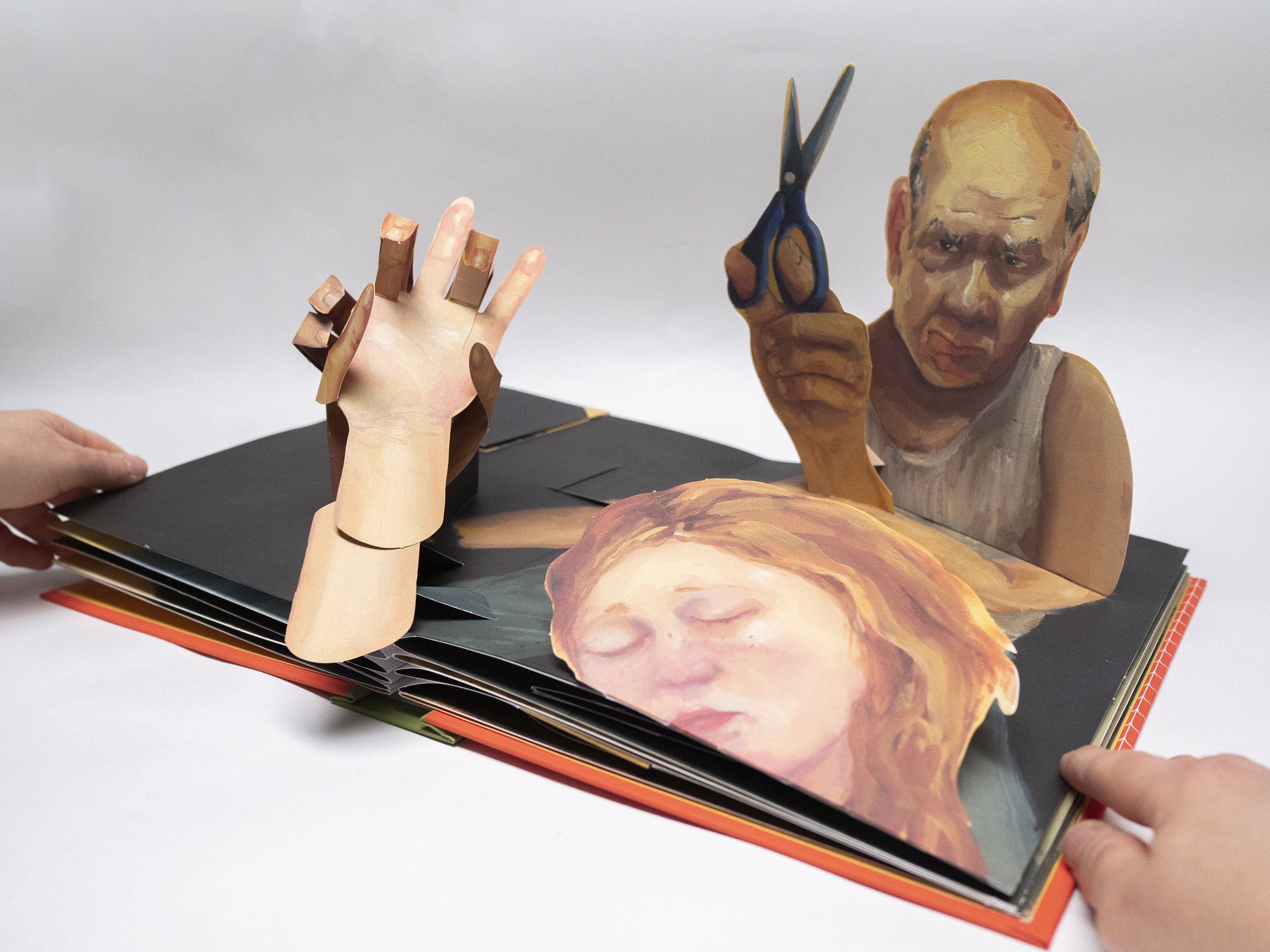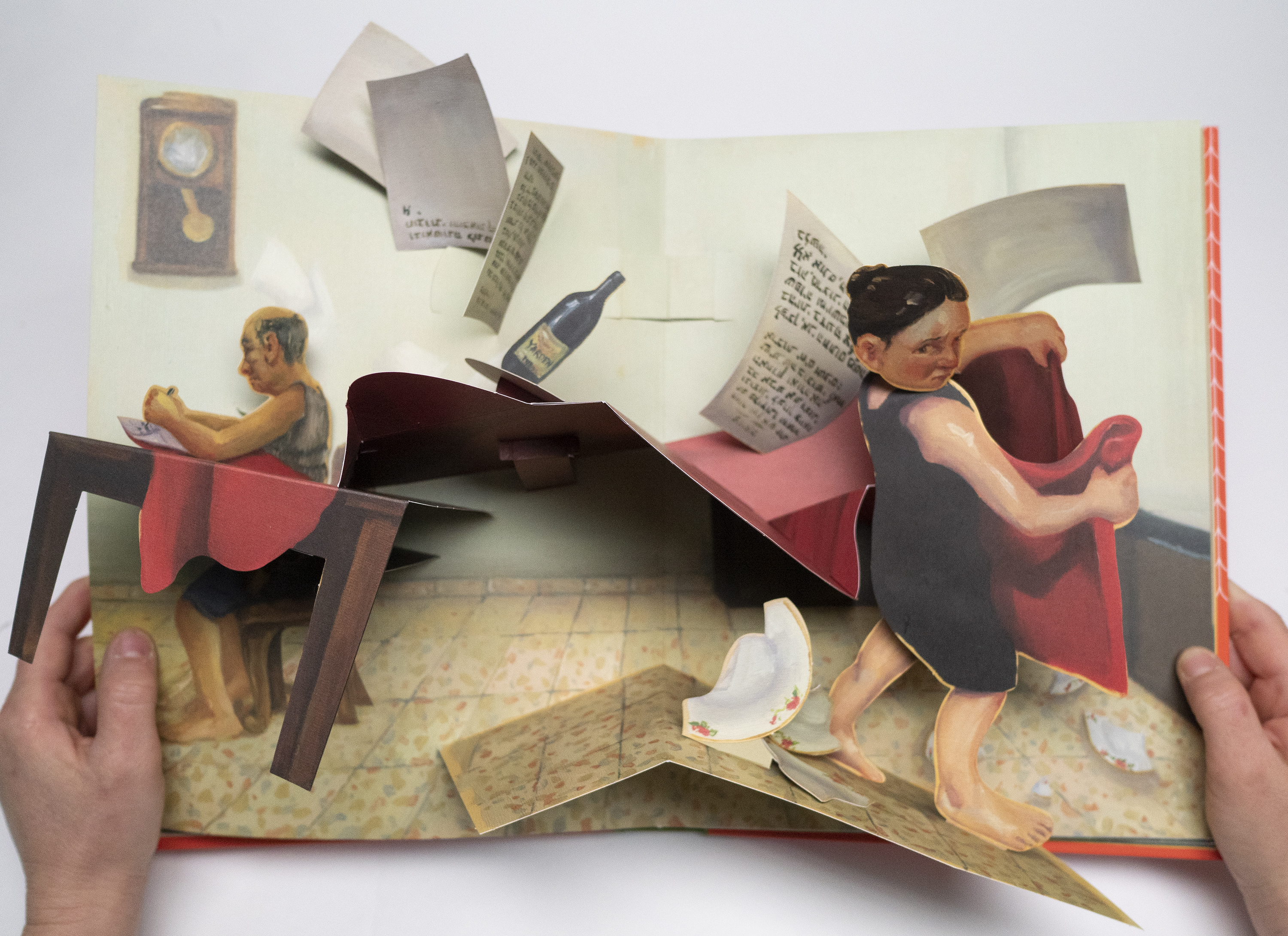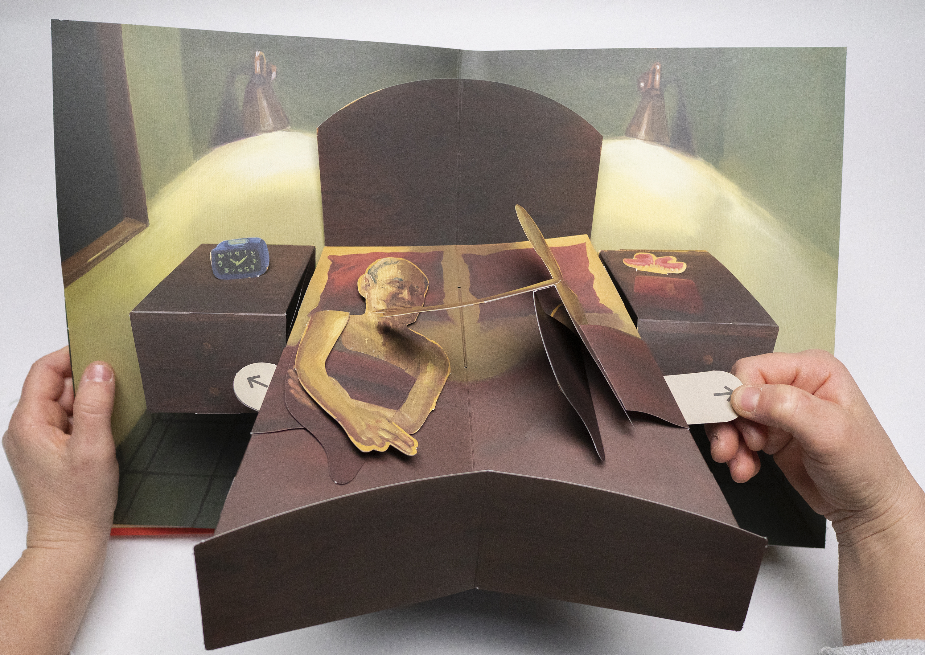 The desire to create and carry through the experience of the exhibition in the world - an experience of movement and franticness, along with intrusiveness and invasion of privacy - took shape in the form of this book: a pop-up book, which embodies something of the three-dimensionality of a sculptural installation, while allowing the reader a very personal and intimate experience. In addition, and as a continuation of what is happening in the exhibition, here the book itself requires us not only to take a closer look - but to take an active and real part in the movement that it offers, while we are asked to pull, open or fold its various parts, to find out what happens in it and dictate its mode of operation. Hence, the book in front of you is not a documentation of the exhibition, but a complex and developed continuation of it: while in the exhibition we are unable to touch the artistic object, here it is permitted and even desirable. And if in the exhibition we could only peek inside the house for a few moments - then now we get to bring the whole exhibition into our own home, forever.
