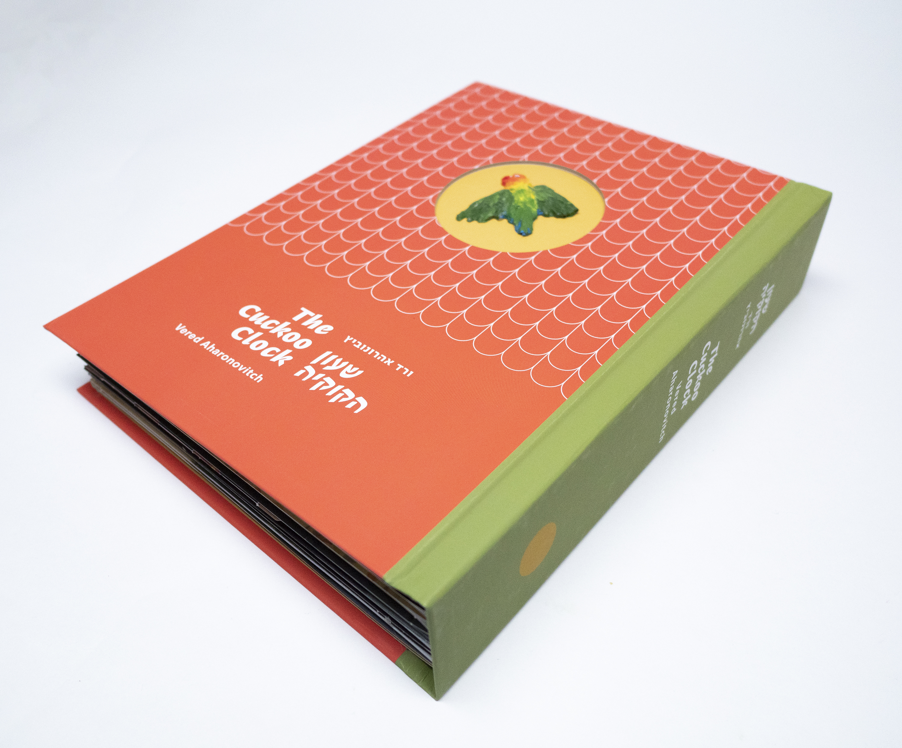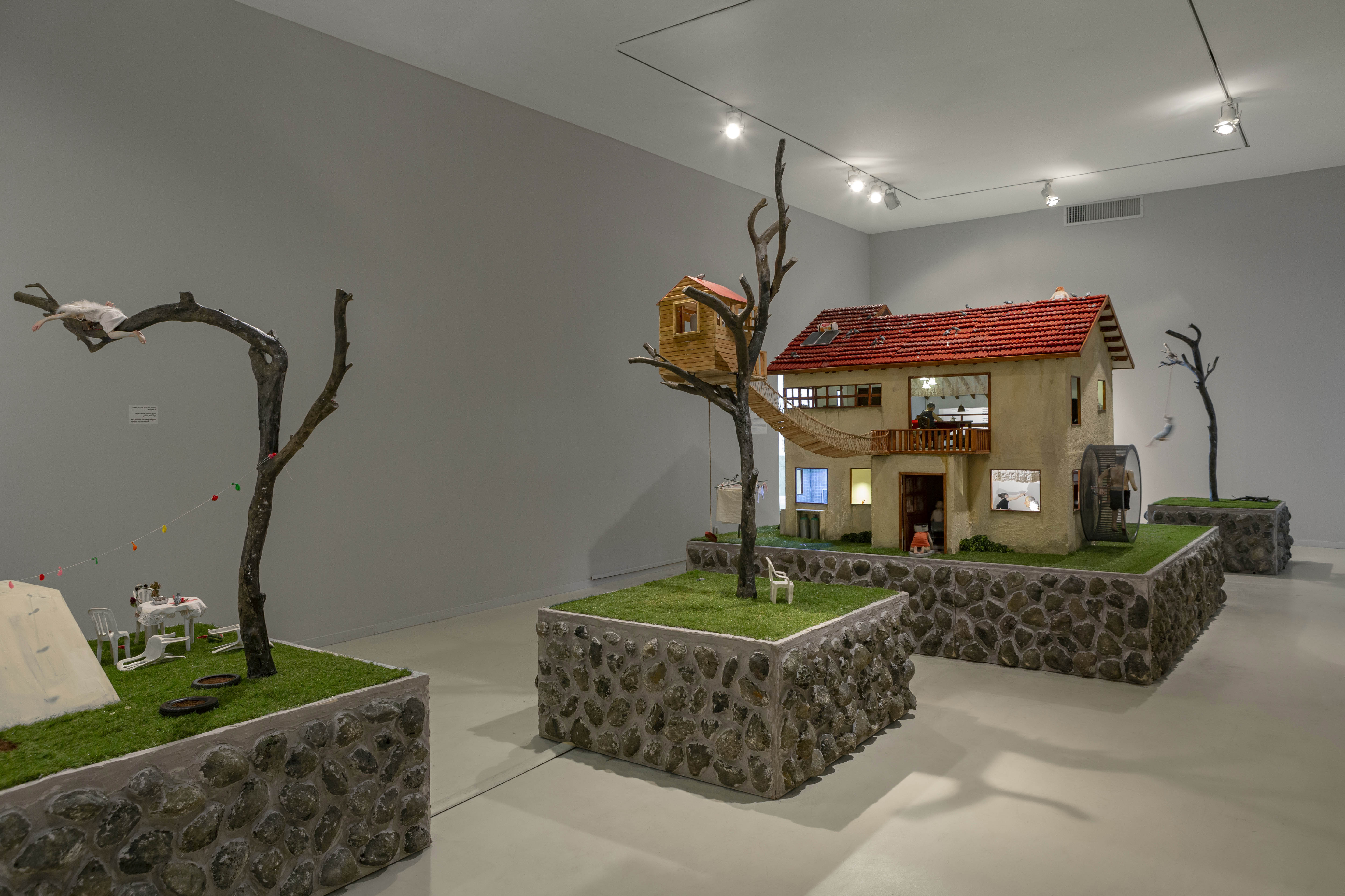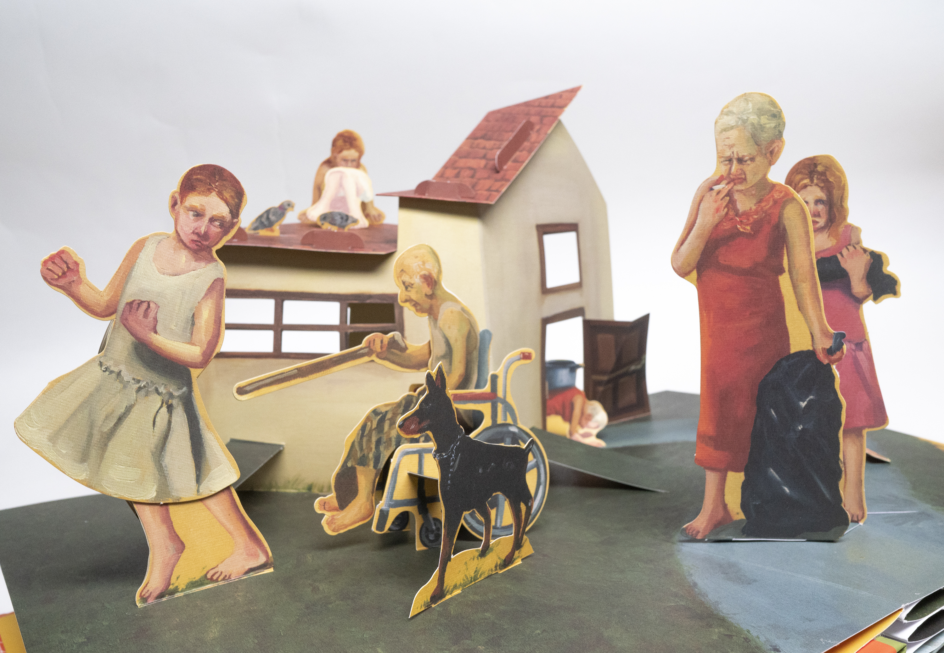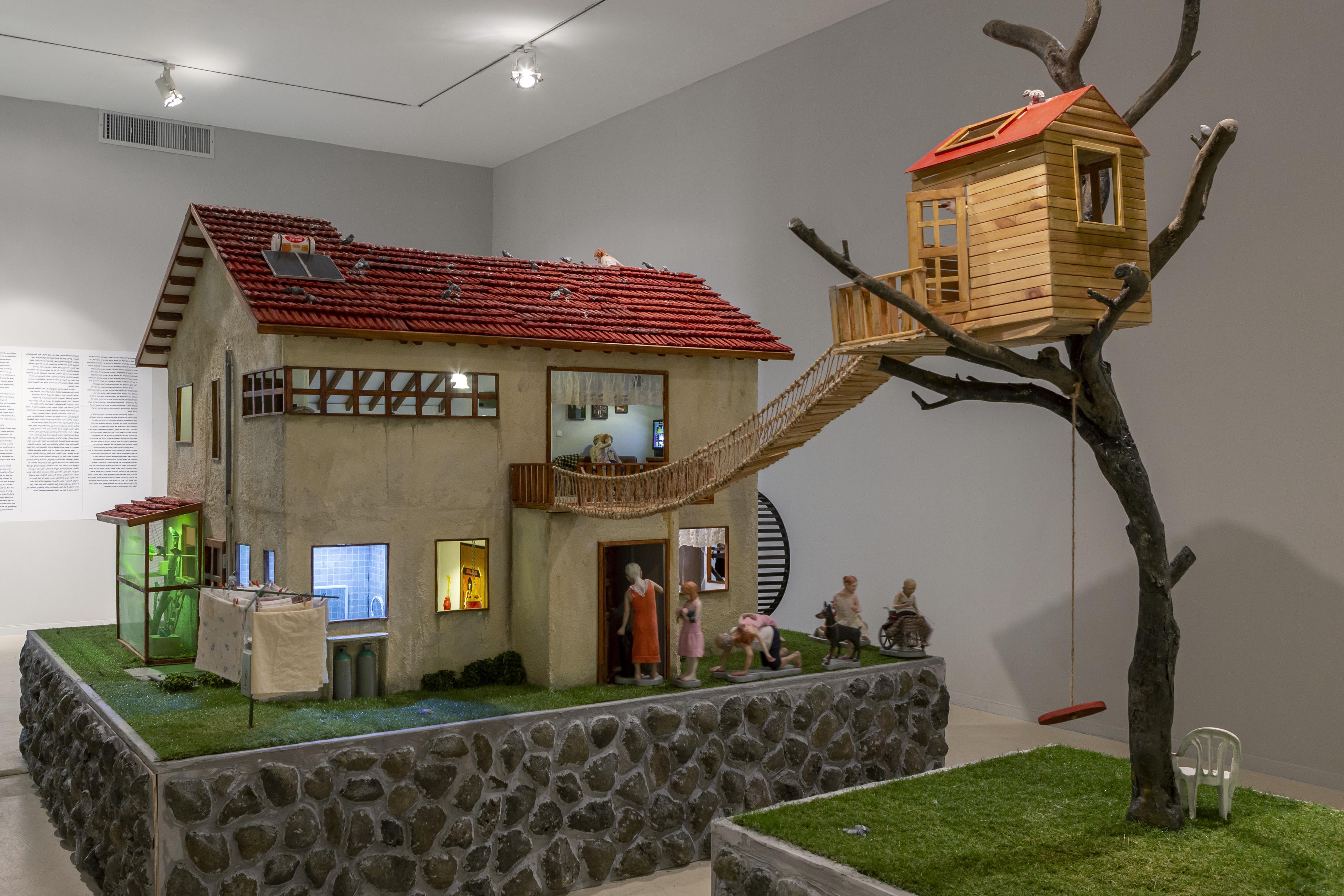 “The book in front of you was created following the exhibition The Cuckoo Clock by Vered Aharonovitch, curated by Dr. Aya Lurie, which was displayed at the Herzliya Museum of Contemporary Art between September 2019 and January 2020. The exhibition featured a large-scale kinetic installation, the central part of which was a house built as Aharonovich's childhood home. Through the windows and doors of the house, viewers could peek inside, and see the events taking place in it and the various figures who lived inside it, who were also inspired by Aharonovich's family. Next to the house a few trees were set - on one hung a swing with an old woman sitting on it. On another, a wooden house was built, in which a father and daughter aimed a rifle at the roof of the house, and on the branches of the third tree, a girl with bird wings was placed, watching the roof of a shelter beside which a grave for a pet rabbit was dug.